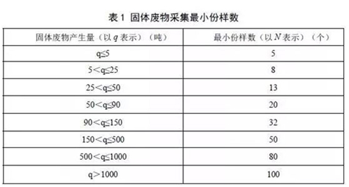4.2.2固體廢物為歷史**固體廢物時,若采集可類比工藝產(chǎn)生的固體廢物,則依據(jù)可類比工藝的固體廢物產(chǎn)生量按照表1確定需要采集的最小份樣數(shù);若采集歷史**固體廢物,應以**的固體廢物總量為依據(jù),按照表1確定需要采集的最小份樣數(shù)。
